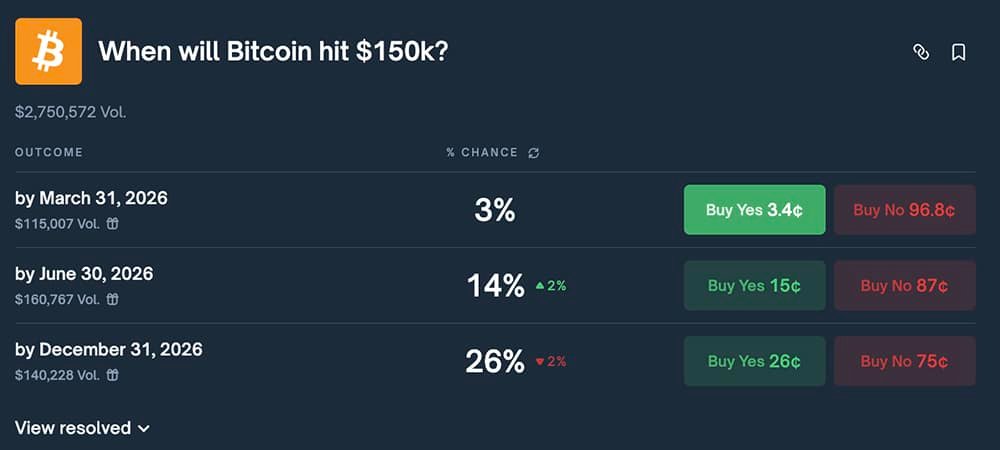 Bettors on a prediction market, Polymarket, currently give Bitcoin only a 26% chance of trading above $150,000 at any point in 2026. Other related markets are more optimistic on lower milestones, with odds near 80% that Bitcoin touches $100,000 before 2027.