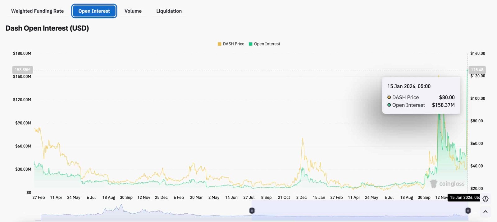 CoinGlass lists DASH open interest near $155M and about $3.58Bn in futures trading volume in the past 24 hours.
